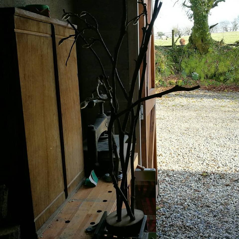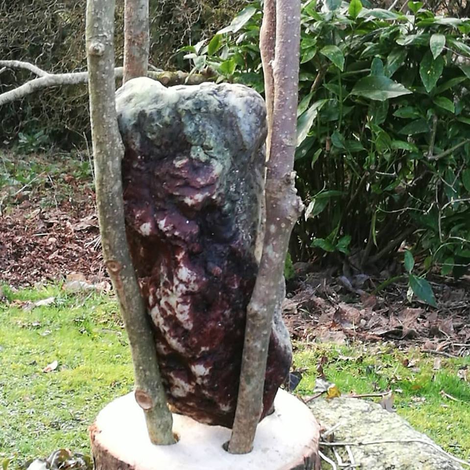 There are three photographs below, the first documents part of the killick making process, followed by a close up of the rock, with the magnolia tree just visible in the background and a final photograph taken under studio lighting, with shadows (see blog notes on Killick Project).