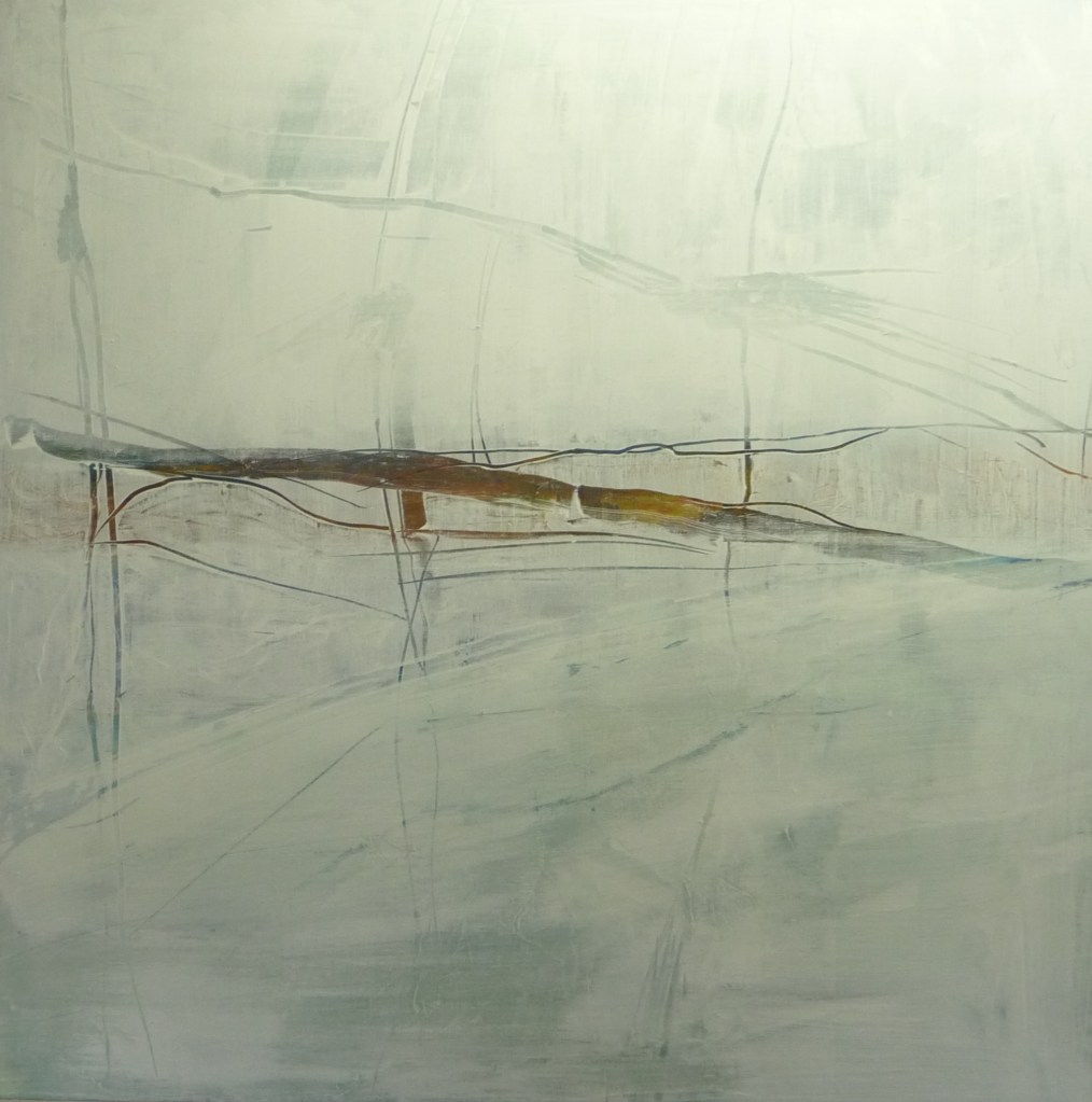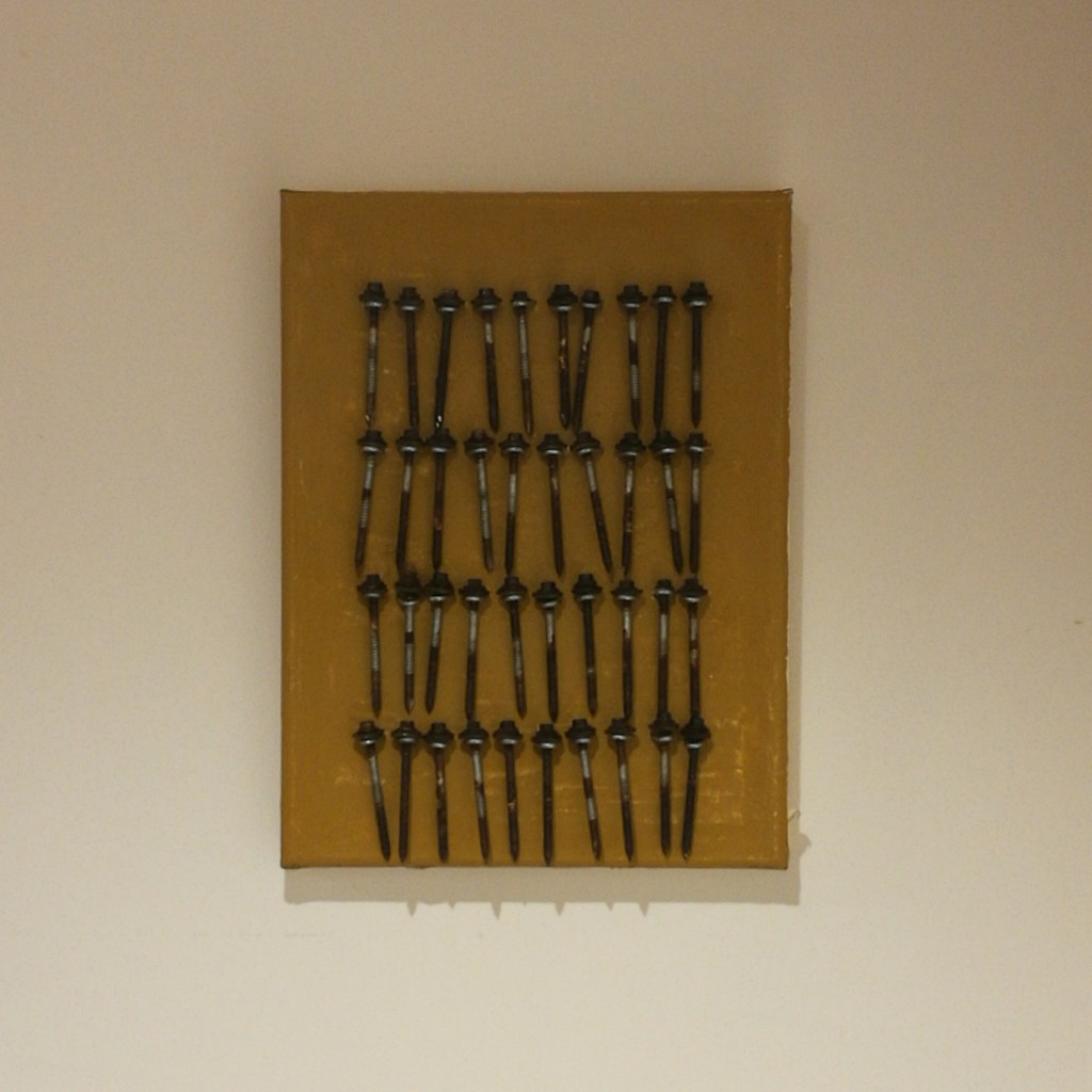 The opening quotation comes from my published notes in 2019, when I began this project. However, the actual reason the studio roof leaked and the screws became rusty was due to condensation forming within the roof structure, and not rain dripping and pouring in. A new roof, coated with an anti-condensation product, has now replaced the old one. So, with a dry space in which to work, I return to the project and coat each of the rusty screws with two coats of PVA to retain their integrity and history. I then attach these endearing found objects on a golden acrylic canvas, backed with timber, each one secured by a robust U nail…