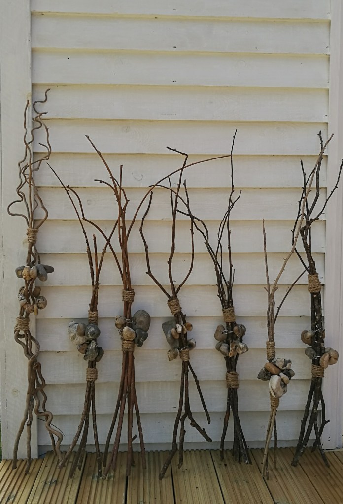 The frames sat on a shelf in my work space for several months, and then I found hag-stones in the garden (small stones/pebbles with a hole through them) and the idea of the Killick and stones re-emerged.